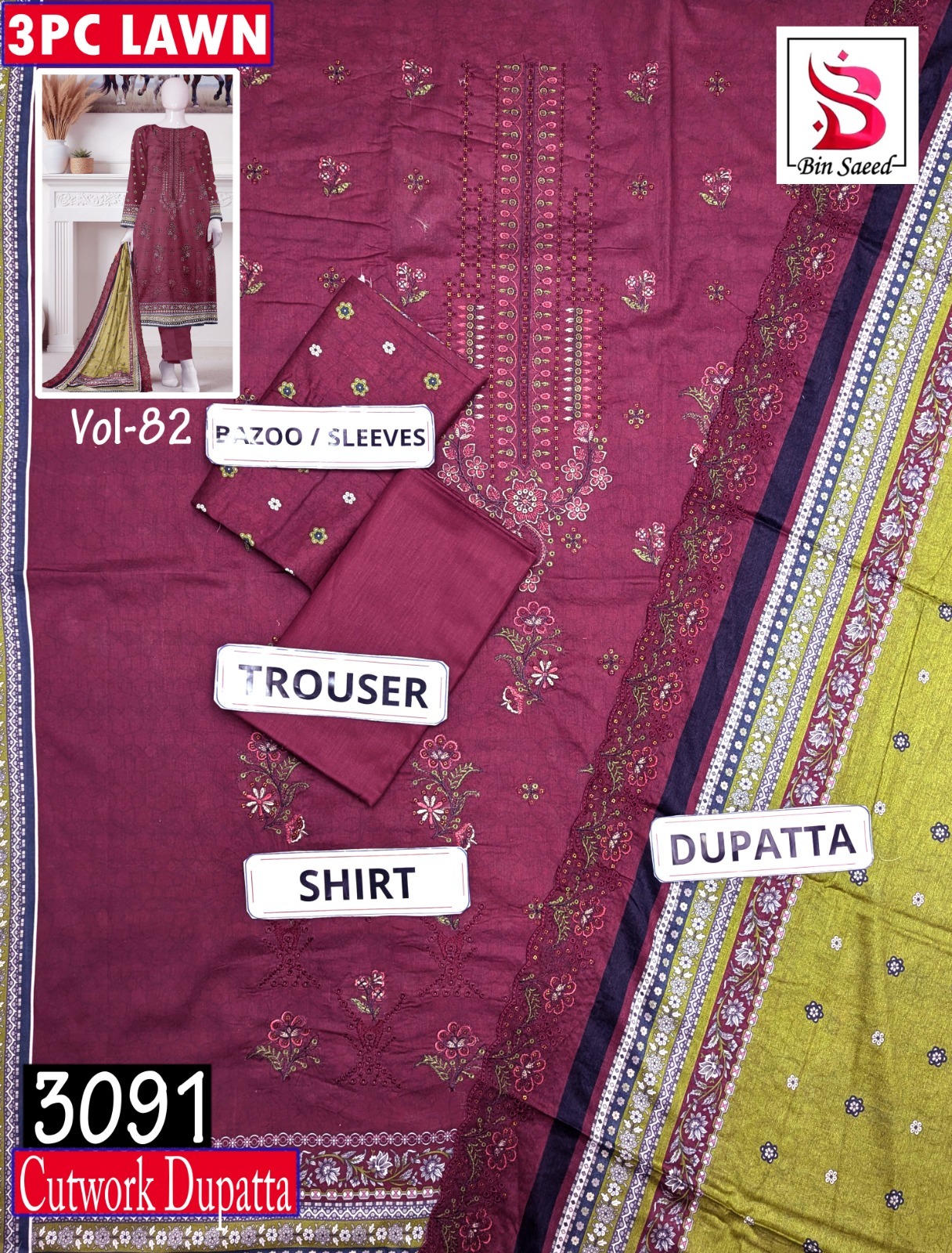 BIN SAEED 3PC LAWN CUTWORK EMB DIGITAL PRINTED VOL-82-3091
