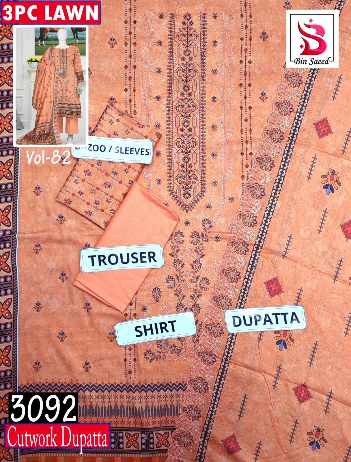 BIN SAEED 3PC LAWN CUTWORK EMB DIGITAL PRINTED VOL-82-3092