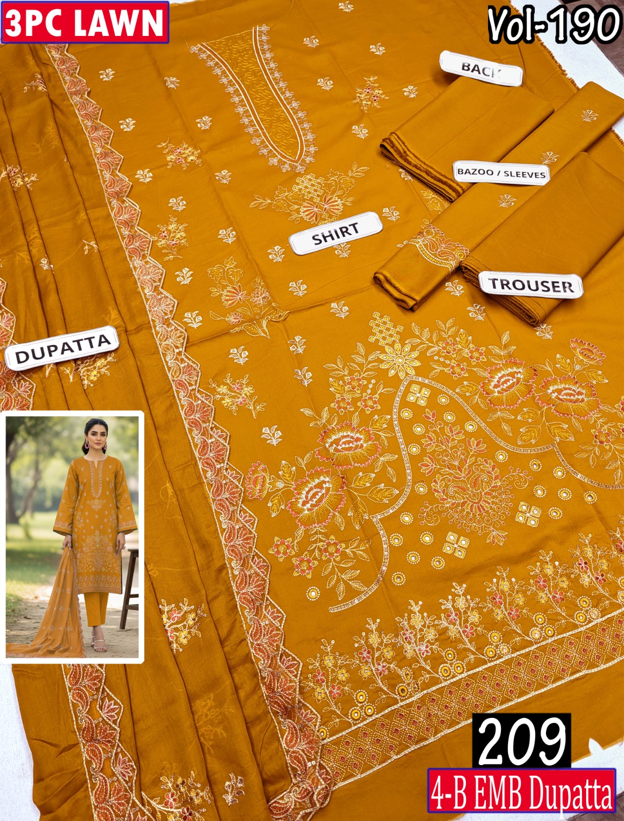 ESHAAL 3PC EMBR SEQUIN DAMAN WORK 4-BORDER LAWN DUPATTA VOL-190-209