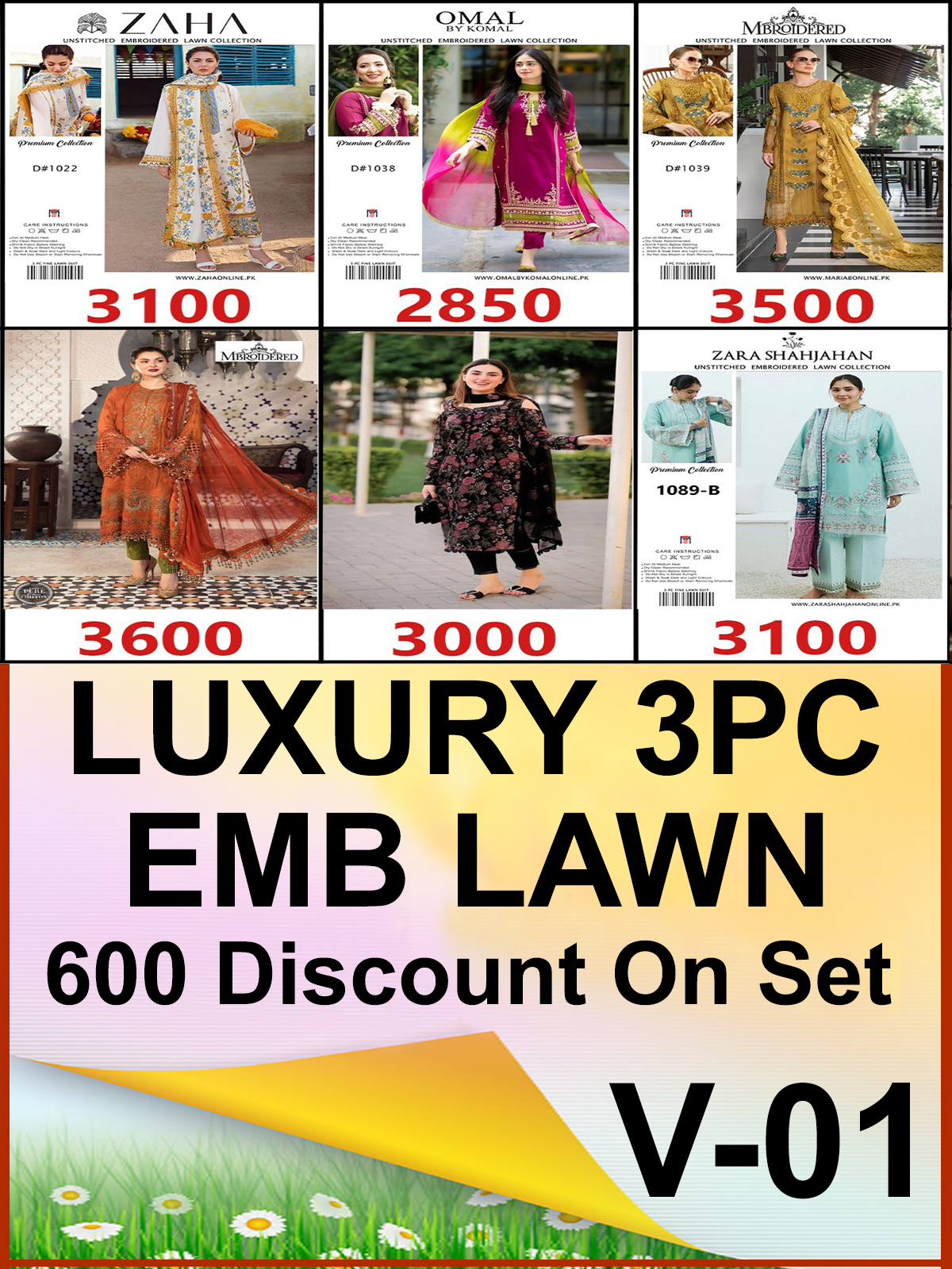 MIX BRANDS 3PC EMBROIDERED LUXURY DESIGNER LAWN VOL-01-Set Of 06 Dresses