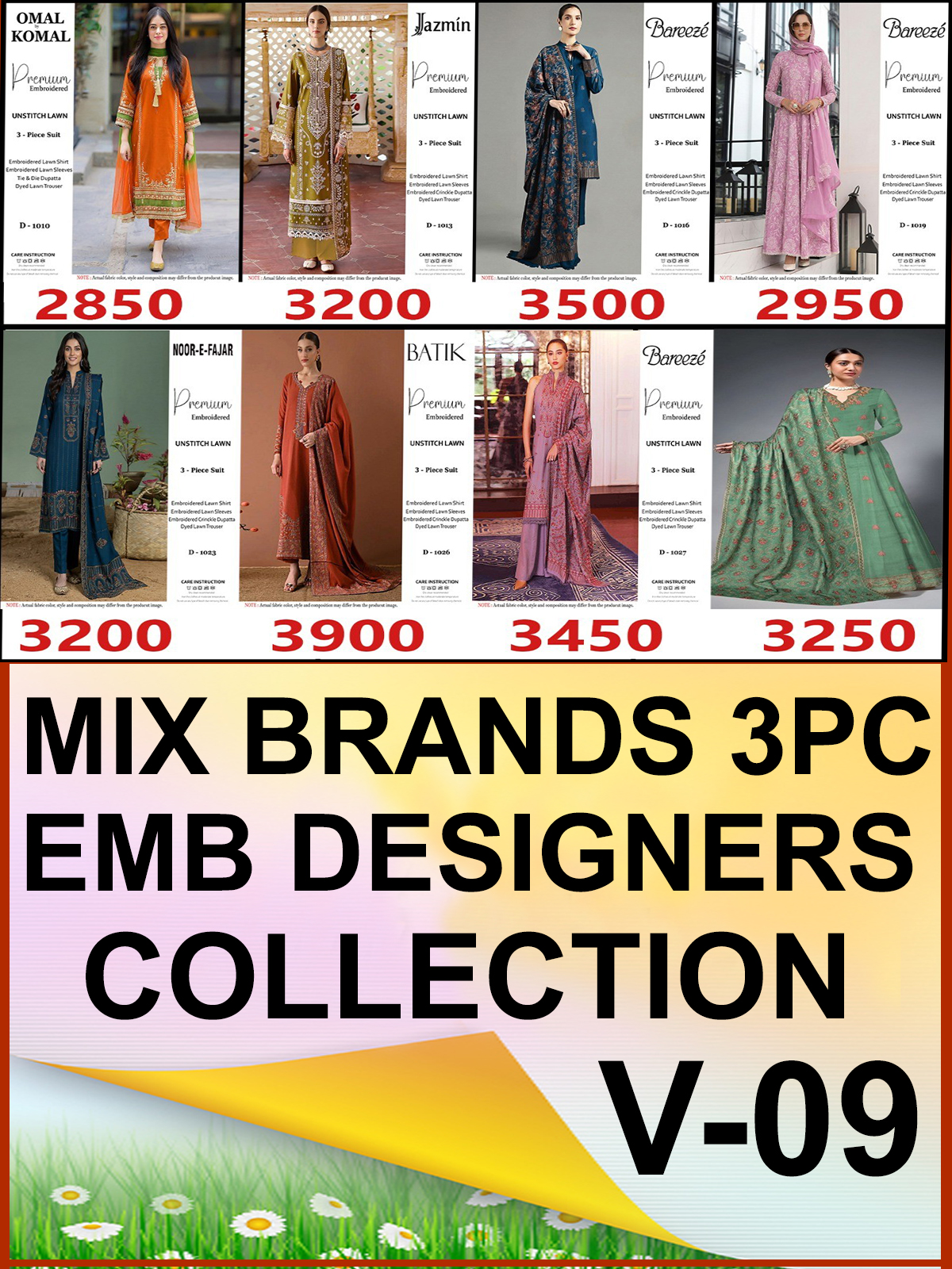 MIX BRANDS 3PC EMBROIDERED LUXURY DESIGNER LAWN VOL-09-Set Of 8 Dresses