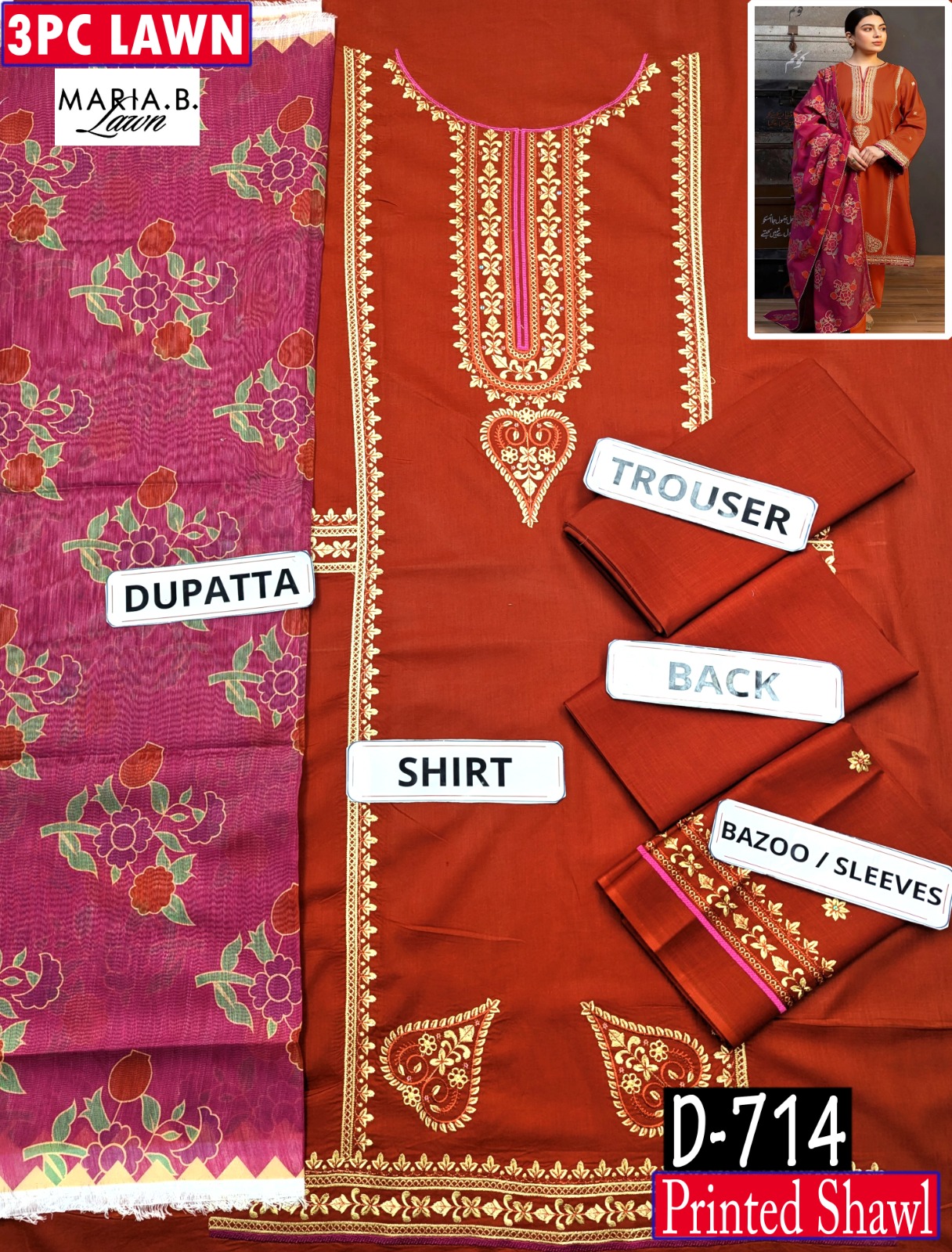 MIX BRANDS 3PC EMBROIDERED LUXURY DESIGNER LAWN VOL-10-D-714