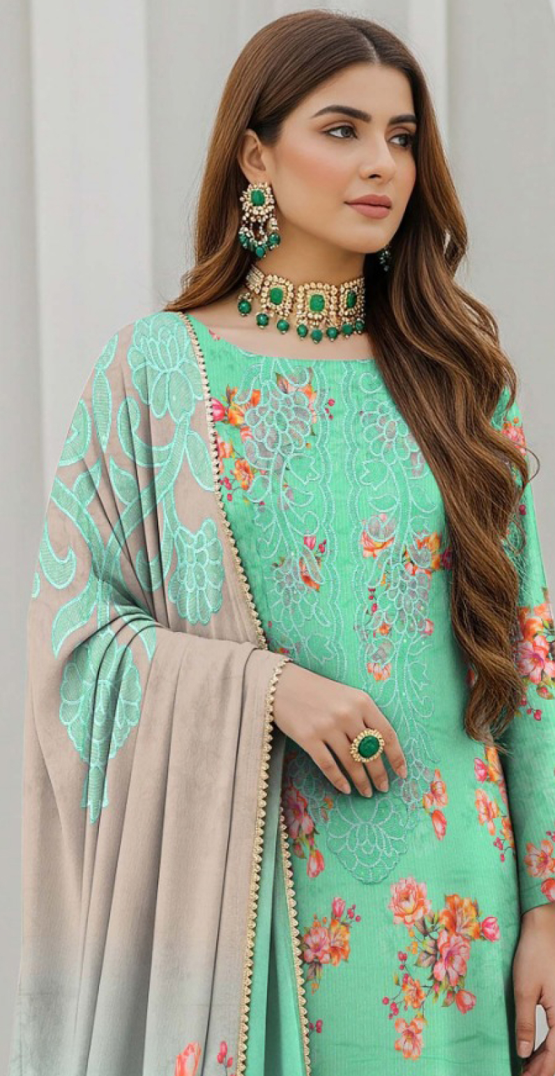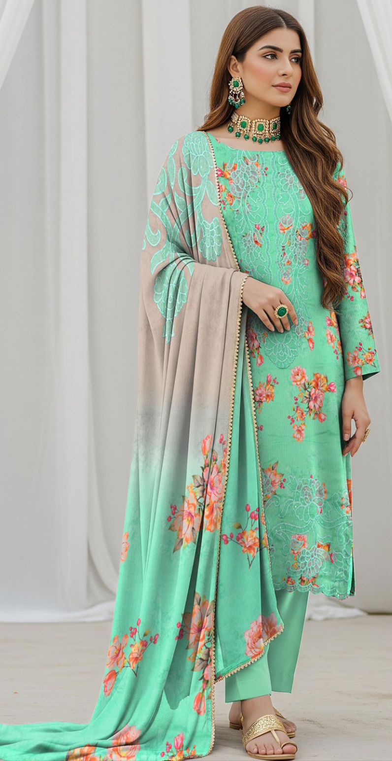 This complete set includes a printed embroidered shirt, a comfortable matching trouser, and a stylish dupatta. The dupatta adds movement and grace to the overall outfit while completing the coordinated look. With all three pieces designed to complement each other, the suit provides a ready-to-wear ensemble that requires minimal styling.