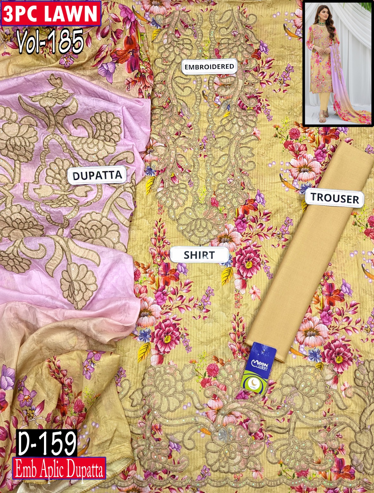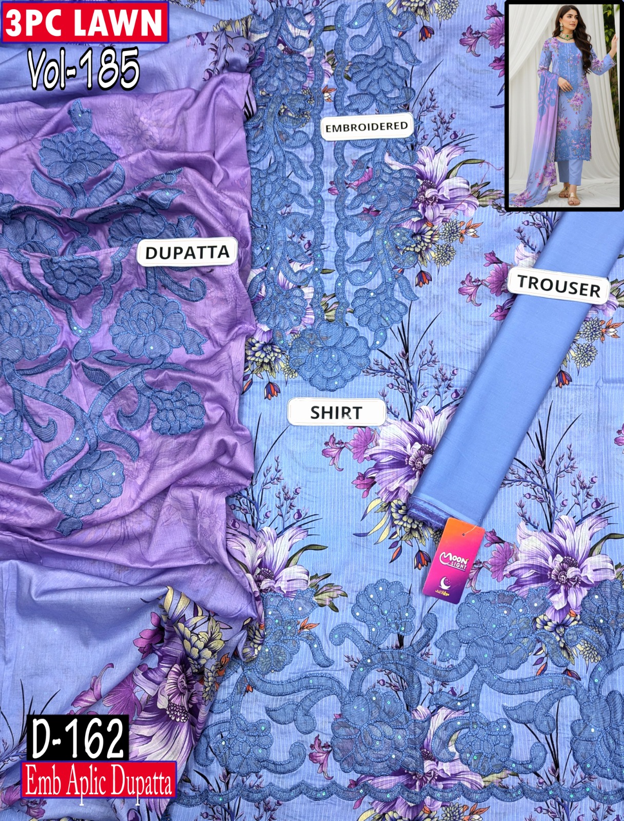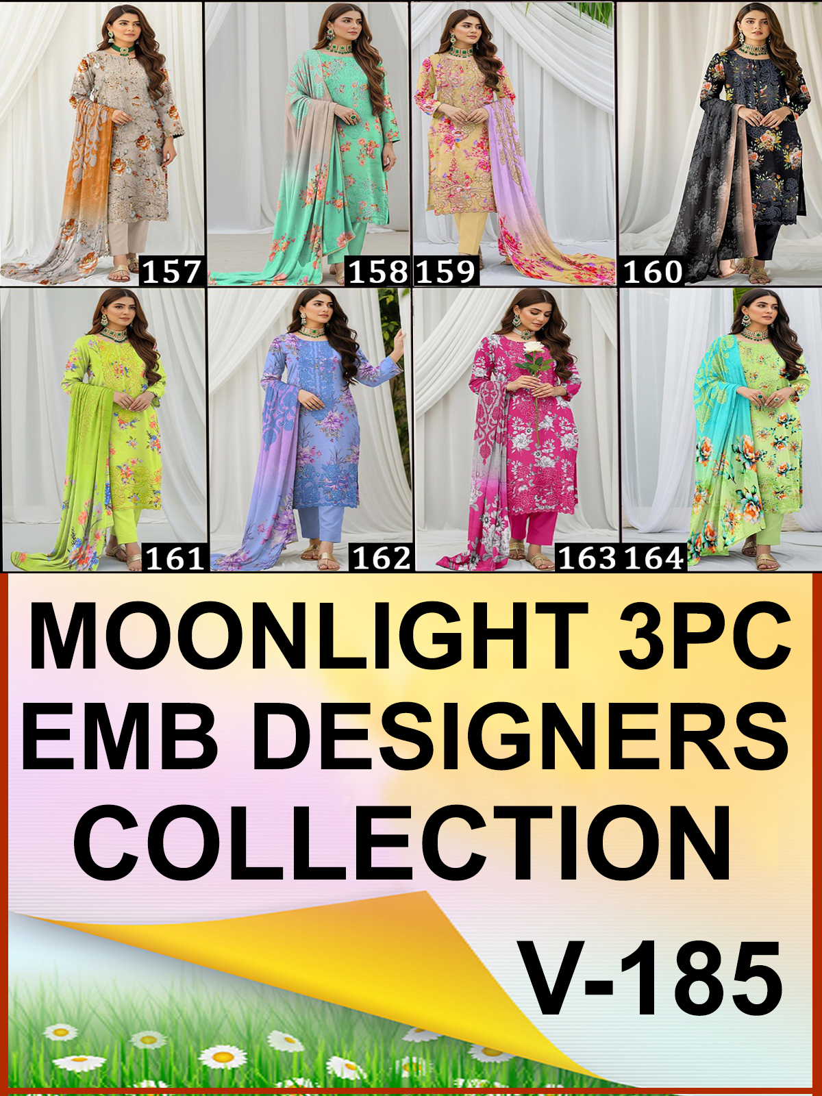 MOONLIGHT 3PC EMBR SEQUIN BANA DORA PRINTED APLIC WORK DESIGNER VOL-185-Set Of 8 Dresses
