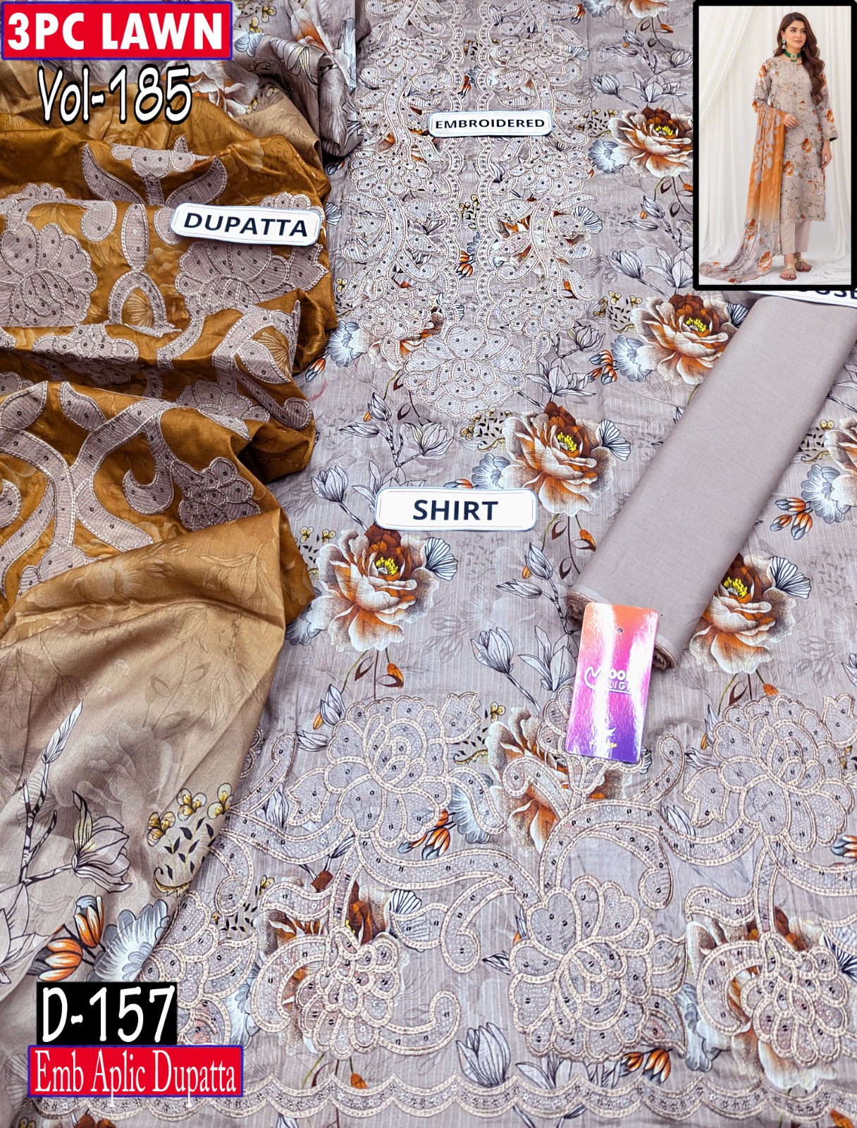 The three-piece set includes a printed embroidered shirt, a comfortable matching trouser, and a stylish dupatta. The dupatta adds elegance and flow to the outfit, completing the ensemble perfectly. Together, these pieces create a coordinated look that is both fashionable and practical.