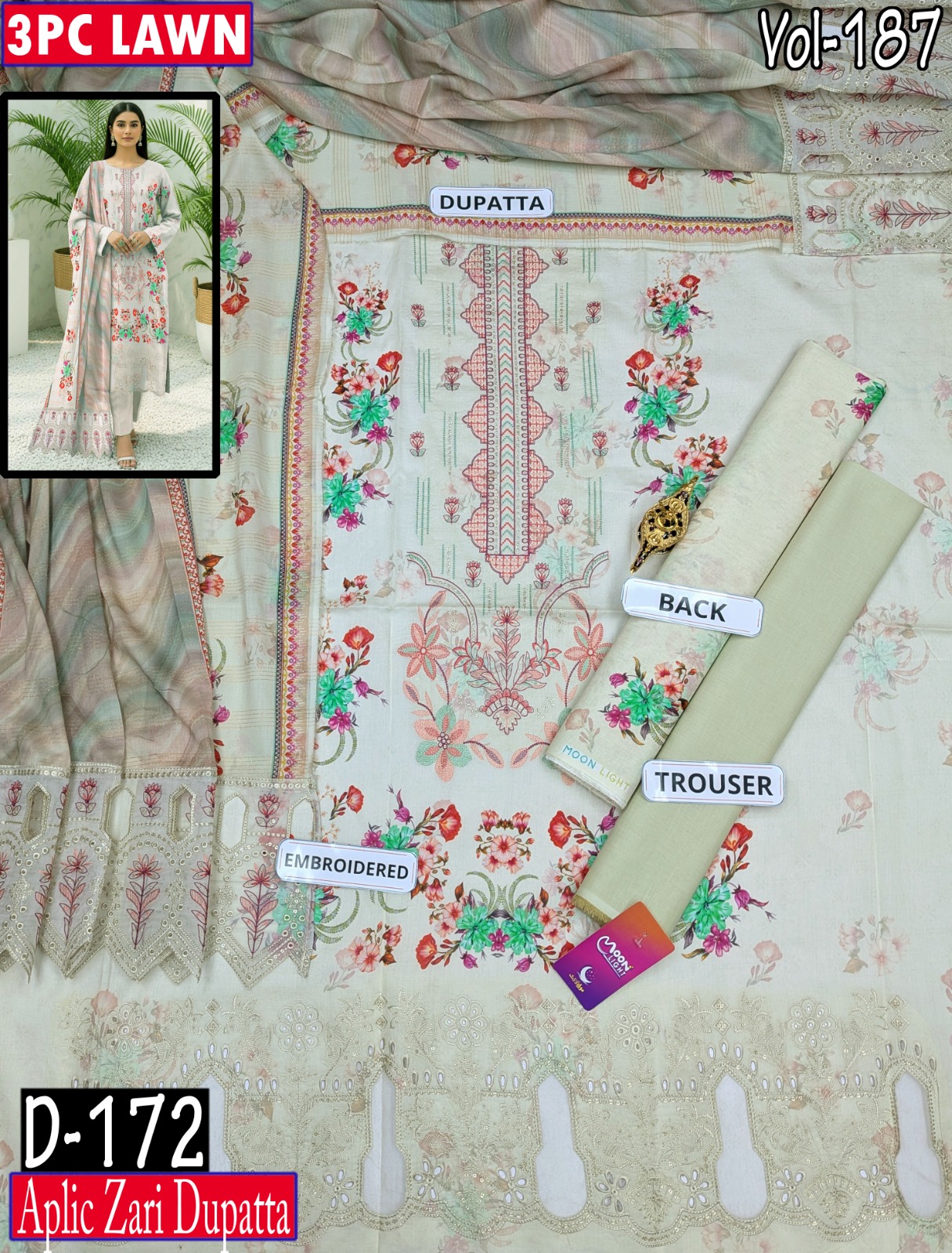 MOONLIGHT 3PC EMBR SEQUIN DIGITAL PRINTED APLIC WORK LAWN 90/88 DESIGNER VOL-187-172