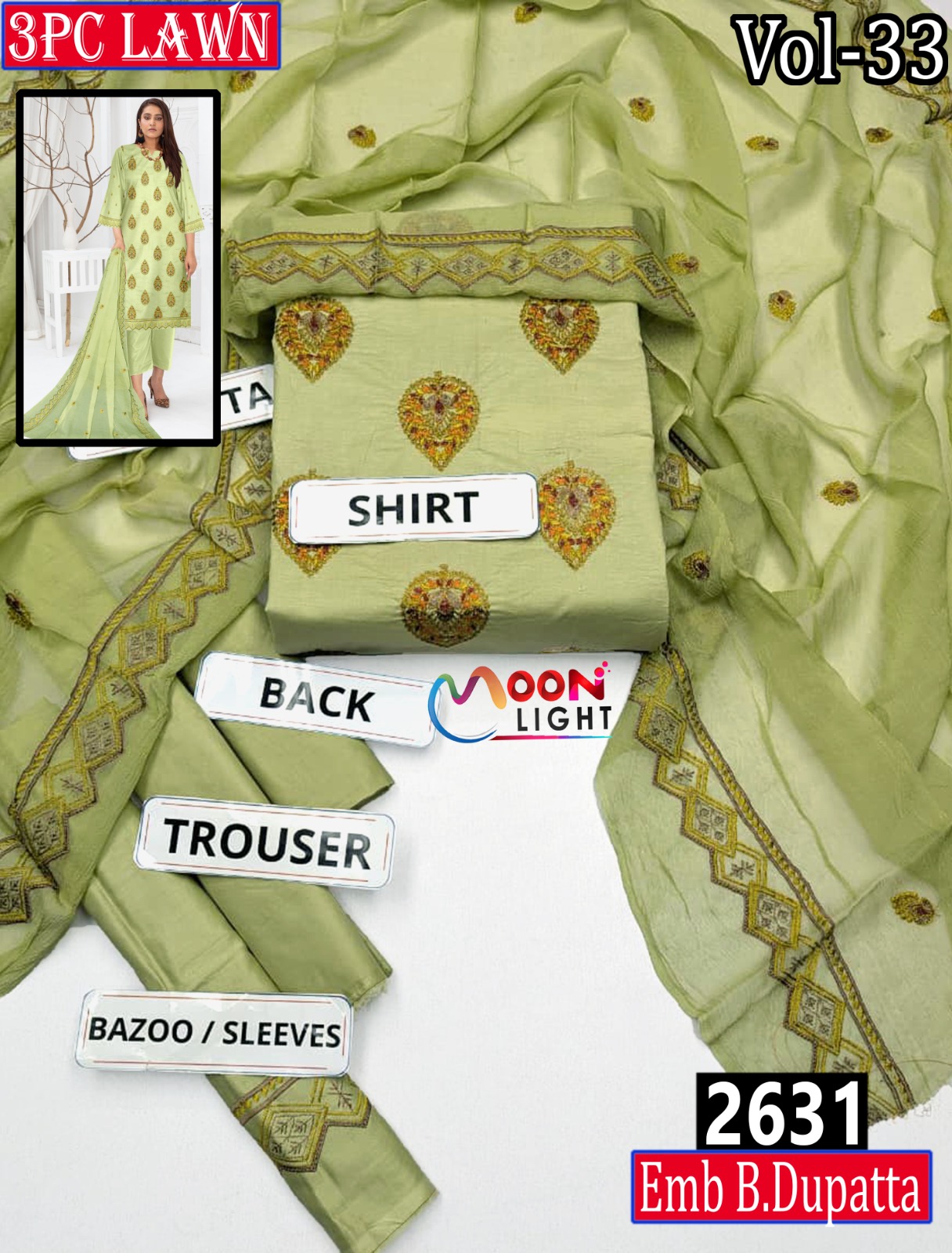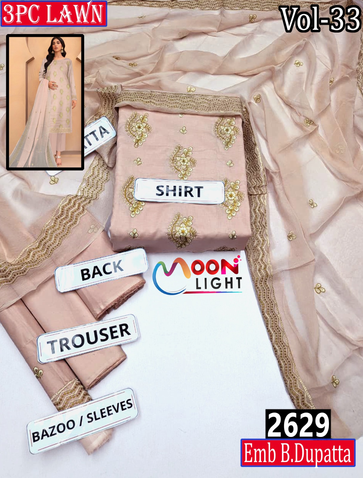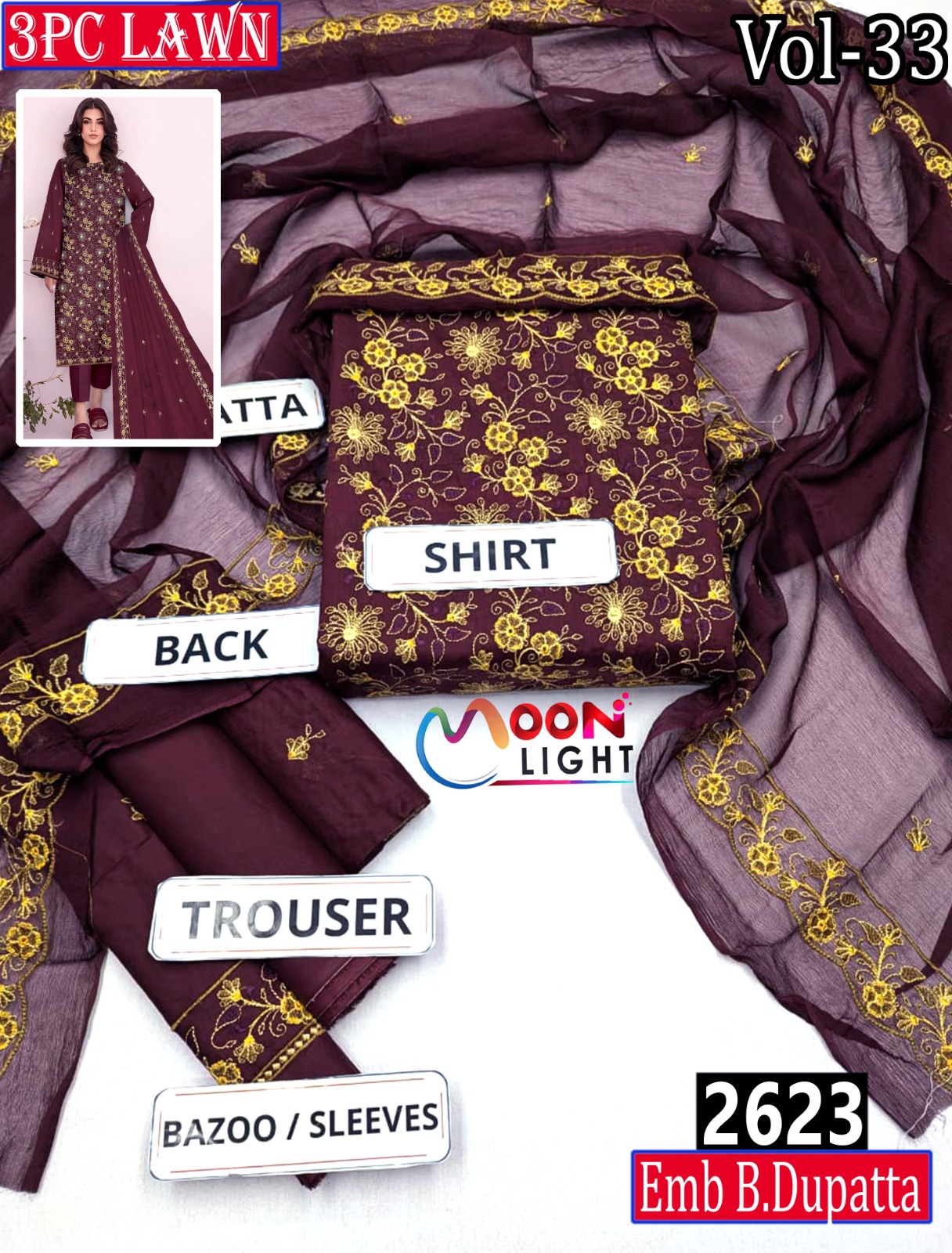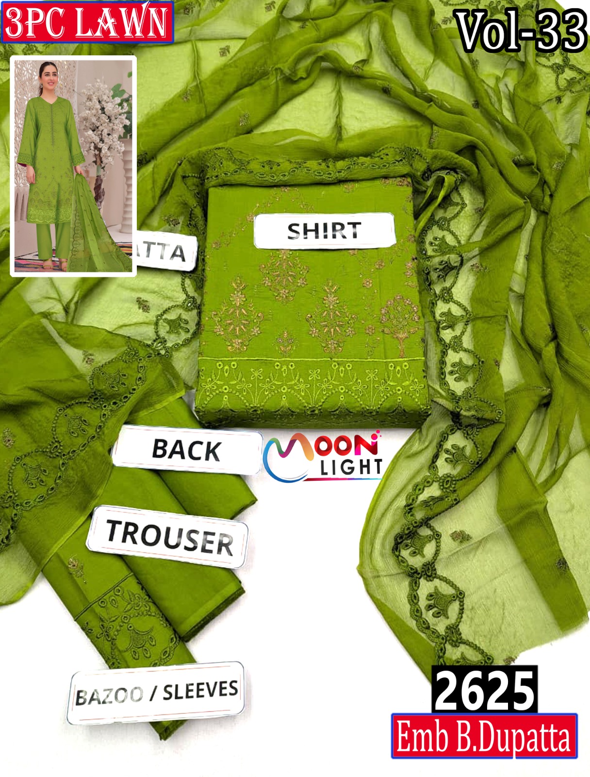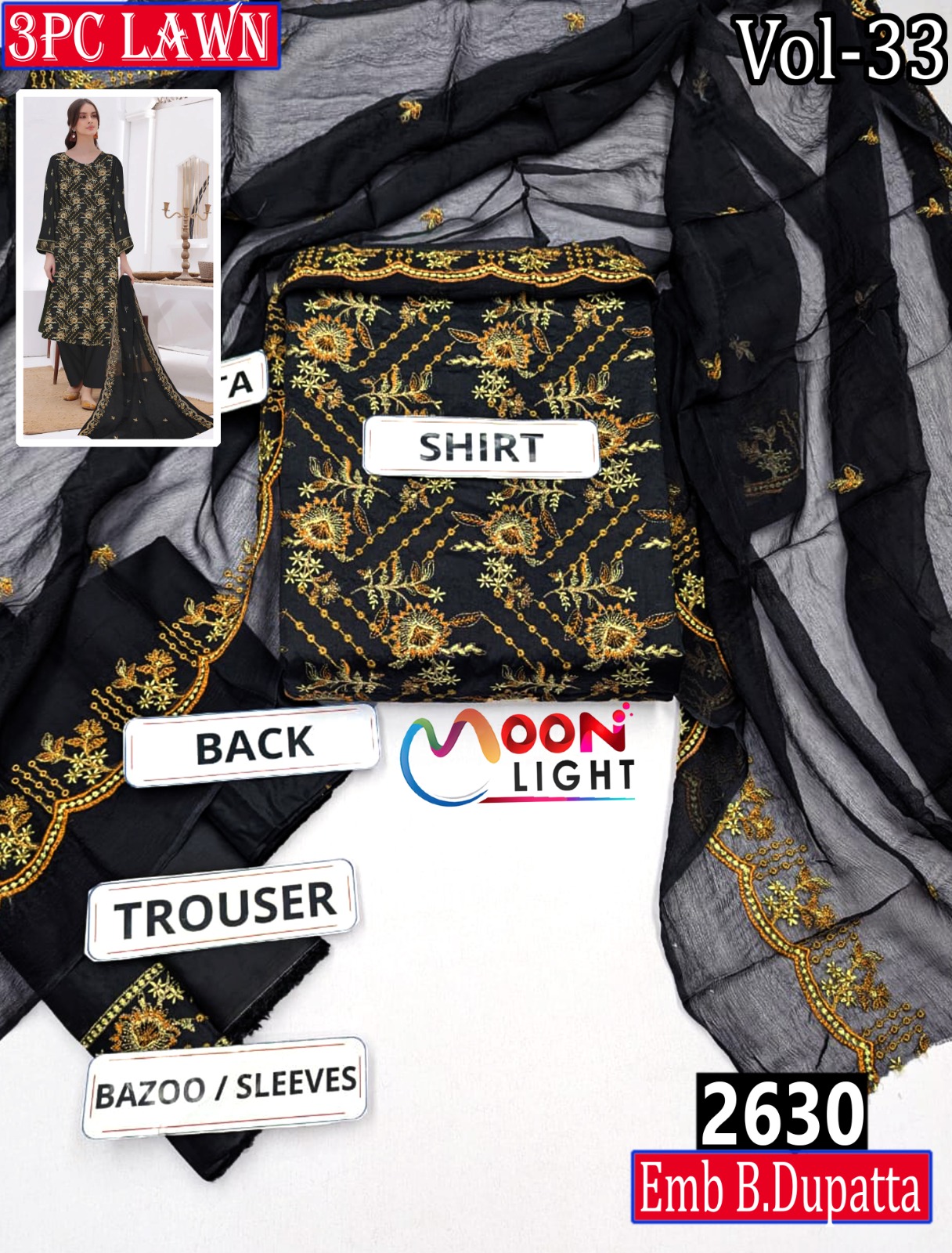 MOONLIGHT 3PC EMBROIDRED DESIGNER LAWN SUMMER VOL-33 -SET OF 6 DRESSES